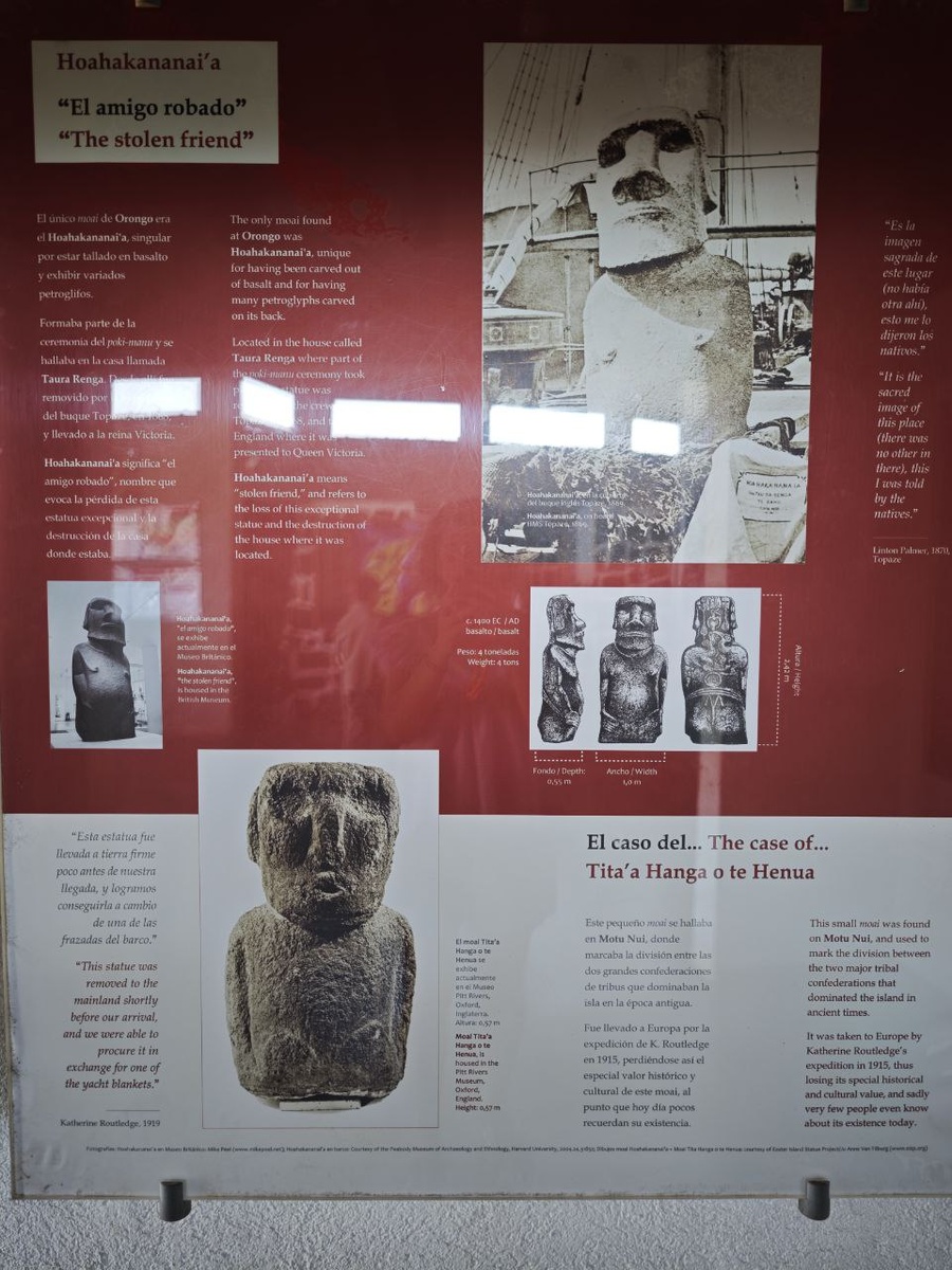 ! В одной поездке послушал гида в Египте с рассказами, что мумии вывозились в Англию и там их разматывали в светских салонах на потеху публики, потом послушал гида на острове Пасха. Вот этот каменный истукан, которого здесь называют "украденный друг" находится теперь в Англии. Раскопали, разобрали всю деревню и забрали статую. А она давала манну для удачи в делах.