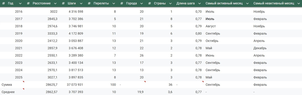 Ну что же, десять лет я ежегодно подводил свои путешественнические итоги года, считал перелеты, города, страны, ну и, конечно же, шаги. Если я вдруг забывал шагомер дома - я возвращался за ним, если он внезапно разряжался, то я отмерял расстояние на карте и тряс его до тех пор, пока не компенсировал нужные шаги. Ну а если же вдруг он посчитал лишнего, пока я ехал в трясущемся автобусе, то я снимал его и старался пройти необходимое лишнее расстояние без браслета. И пока вы ищете номер горячей линии, чтобы сдать меня в дурку, я могу ответственно заявить - зато у меня есть полная и интересная статистика, а у вас её нет. Что мне это даёт? Не знаю, наверное, что-то даёт. Например, я могу составить список 20 интересных выводов по итогам 10 лет с шагомером, а вы это можете прочитать. Статистика взята с 1 января 2016 года по 31 декабря 2025: 1) Общее количество шагов за 10 лет превысило 37 миллионов; 2) За этот период я совершил ровно 100 полетов на самолете; 3) Самым малоподвижным месяцем за
