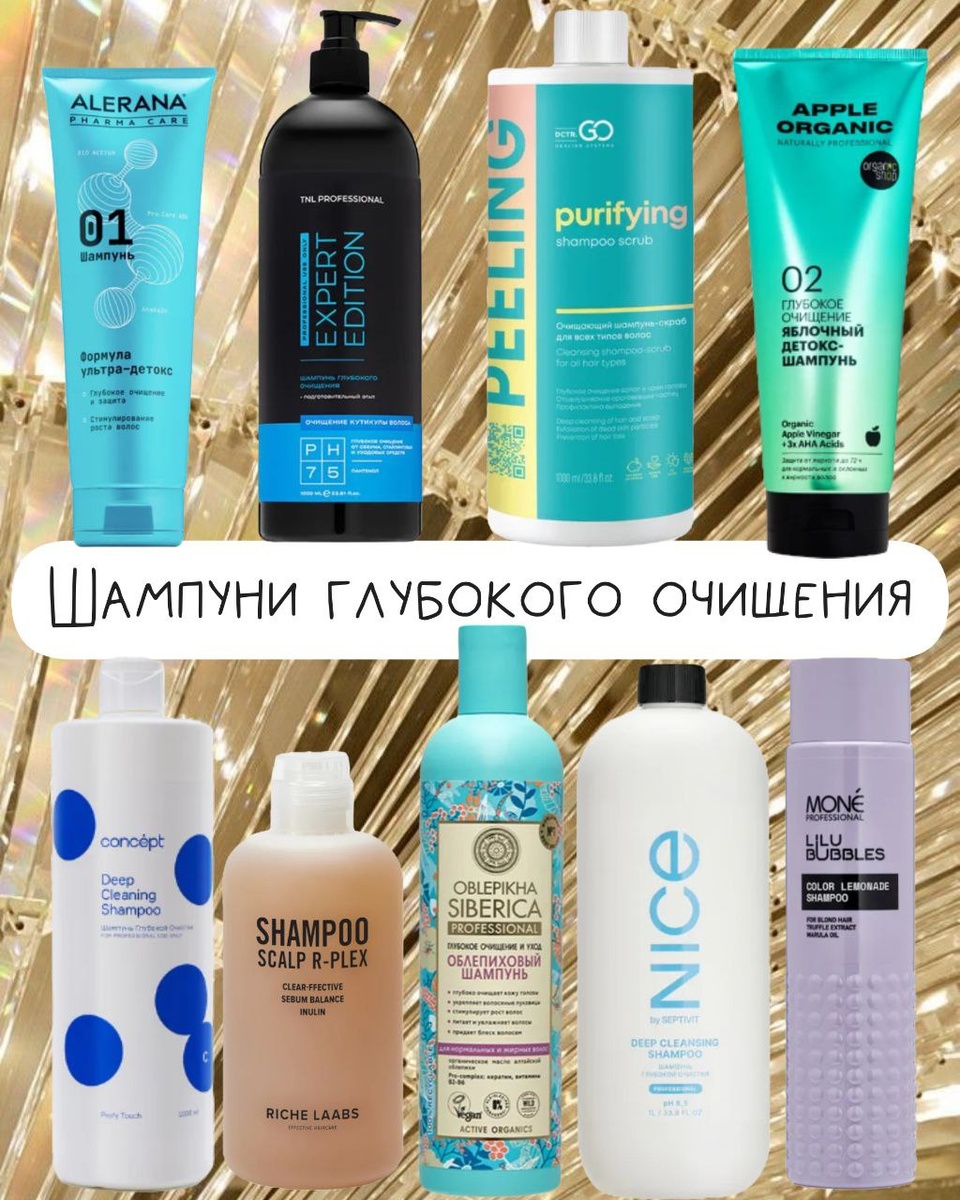 аккуратнее Чтобы было проще ориентироваться, делю на четыре категории 1. Самые бережные для цвета • Очищающий шампунь для объёма Alerana. Почему хорош: мягкое очищение без агрессии, цвет не вымывает. Бонус: кератин и протеины пшеницы ухаживают за длиной 2. Средняя очищающая способность. Используем не чаще 1–2 раз в неделю и всегда с кондиционером • Concept глубоко очищающий ПАВ, то есть классический жёсткий очиститель • TNL Professional • Mone Professional (этот для блондинок, он чистит желтизну) Рабочие шампуни для «сброса» загрязнений, но не для постоянного ухода окрашенных волос 3. Интенсивное очищение, но риск для цвета • Organic Shop глубоко очищающий. Активы: гликолевая, молочная, салициловая, яблочная кислоты. Кислоты раскрывают кутикулу, а значит цвет будет вымываться. Максимум раз в 2 недели • Dсtr.Go лечебный шампунь от перхоти, может сушить длину и влиять на цвет 4. Шампуни под вопросом Составы выглядят неплохо, но нет чёткой информации от брендов • Riche мягкие ПАВ, тео