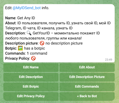 - Настройте бота с помощью кнопок в @BotFather (опционально, но рекомендуется):