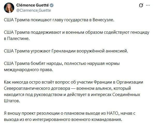 Соответствующую резолюцию предлагает принять вице-председатель Национального собрания Клеманс Гетте, об этом она написала в соцсетях. Всему виной агрессивная международная политика США, а ведь именно Штаты диктуют свои условия военному альянсу. На этом фоне Гетте и предлагает подумать над выходом Франции из НАТО. «Соединенные Штаты при администрации Трампа похитили главу государства в Венесуэле. Соединенные Штаты при Трампе поддерживают и оказывают военную поддержку геноциду в Палестине. Соединенные Штаты при Трампе угрожают Гренландии вооруженной аннексией. Соединенные Штаты при Трампе бомбят людей, полностью нарушая международное право», – пишет вице-председатель Нацсобрания Франции.