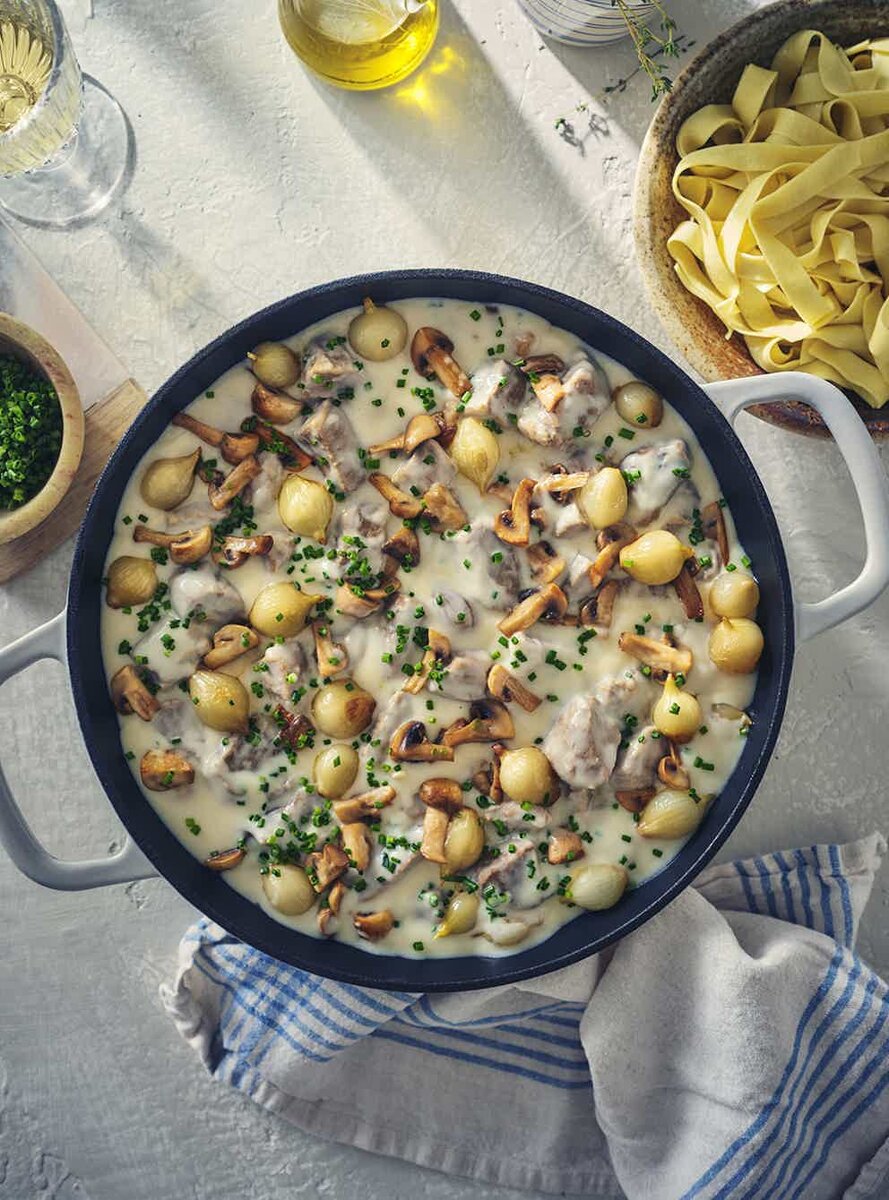 Бланке, символ деревенской кухни, подают как в бистро, так и в семьях, наравне с пот-о-фё или говядины по-бургундски. Он и сегодня остается одним из любимых блюд французов и прочно укоренен в традициях. Ингредиенты 1,4 кг бескостной телячьей лопатки или плеча, нарезанного кубиками 1 луковица, разрезанная пополам 4 гвоздики 2 моркови, каждая нарезана на 3 части 2 стебля сельдерея, каждый нарезан на 3 части 4 зубчика чеснока, разрезанных пополам 4 веточки тимьяна 2 лавровых листа 2,5 л воды 225 г белых шампиньонов, нарезанных четвертинками 115 г сливочного масла 350 г маленьких головок лука-порей очищенных 60 г пшеничной муки 180 мл 15% или 35% сливок 2 яичных желтка 30 мл нарезанного шнитт-лука для подачи Приготовление Положите мясо в большую кастрюлю. Залейте холодной водой. Доведите до кипения и варите 3 минуты. Слейте воду с мяса. Промойте под холодной водой. Тщательно слейте воду. Вымойте кастрюлю. Снова положите мясо в чистую кастрюлю. На разделочной доске воткните гвоздику в луков