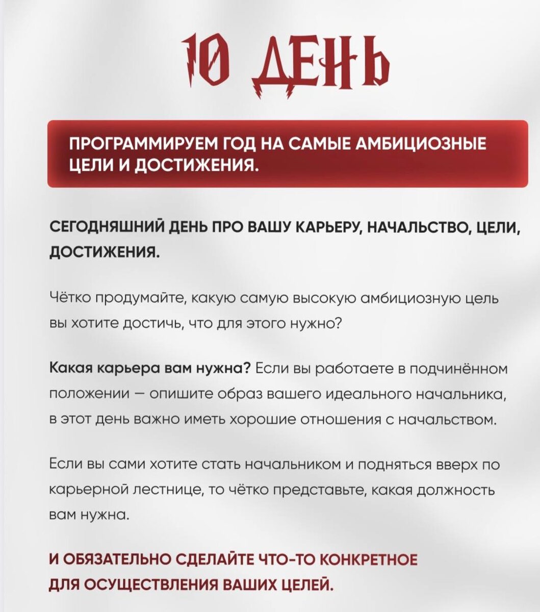 Сегодня день про масштаб. Про то, куда вы действительно хотите прийти — не «как получится», а по-настоящему. 10-й день задаёт вектор: — карьеры — статуса — лидерства — достижений — ваших самых амбициозных целей Это день, когда важно мыслить выше привычного потолка. Сегодня полезно честно ответить себе: — какую самую большую цель вы хотите достичь в этом году? — кем вы хотите быть в своей профессии? — какой уровень ответственности, дохода, влияния для вас норма? Если вы работаете в подчинённой роли — пропишите образ вашего идеального руководителя и те отношения с начальством, в которых вам комфортно расти. Сегодня особенно важно не конфликтовать с авторитетами, а выстраивать уважие и ясность. Если вы сами руководитель или хотите им стать — чётко сформулируйте: — какую позицию вы занимаете — за что вы отвечаете — каким лидером вы становитесь И ключевой момент этого дня — действие. Не просто подумать. Не просто помечтать. А сделать хотя бы один конкретный шаг: — написать план — наз