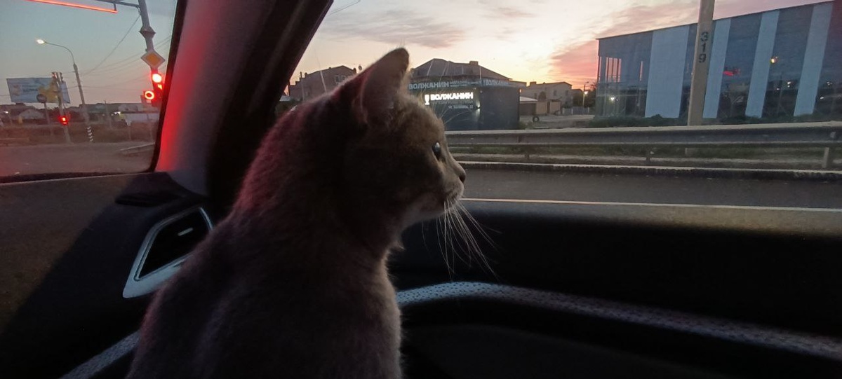 Кот побродил по машине, а потом весь путь до Волгограда спал на коленях либо у меня, либо у ребенка. Иногда с интересом смотрел в окно.