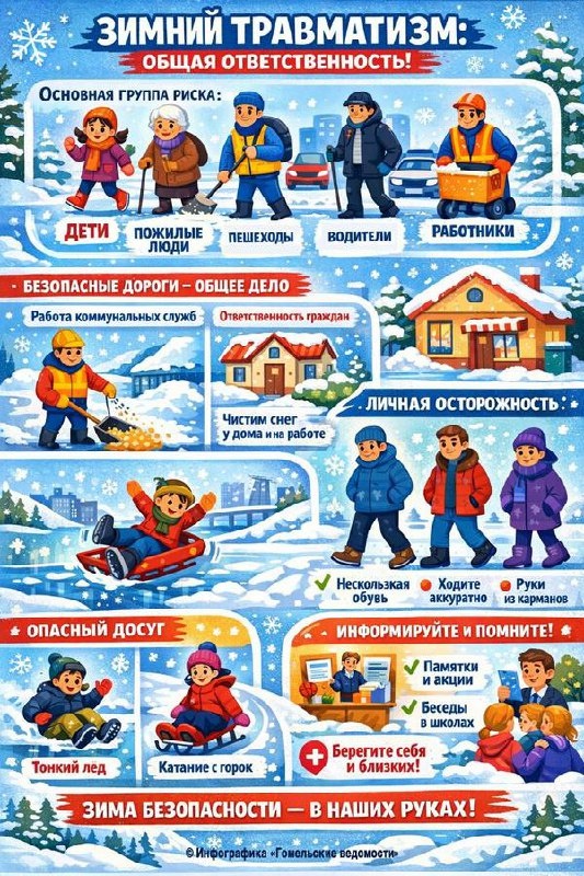 Зима — время красоты, ожиданий и праздничного настроения. Но вместе с пушистым снегом и морозным воздухом приходит и другая сторона сезона — повышенный риск травм. Скользкие тротуары, наледь на дорогах, риск падений, бытовые травмы при катании на коньках, санках, лыжах — все это требует не только осторожности, но и грамотной профилактики. Подпишитесь на Гомельские ведомости