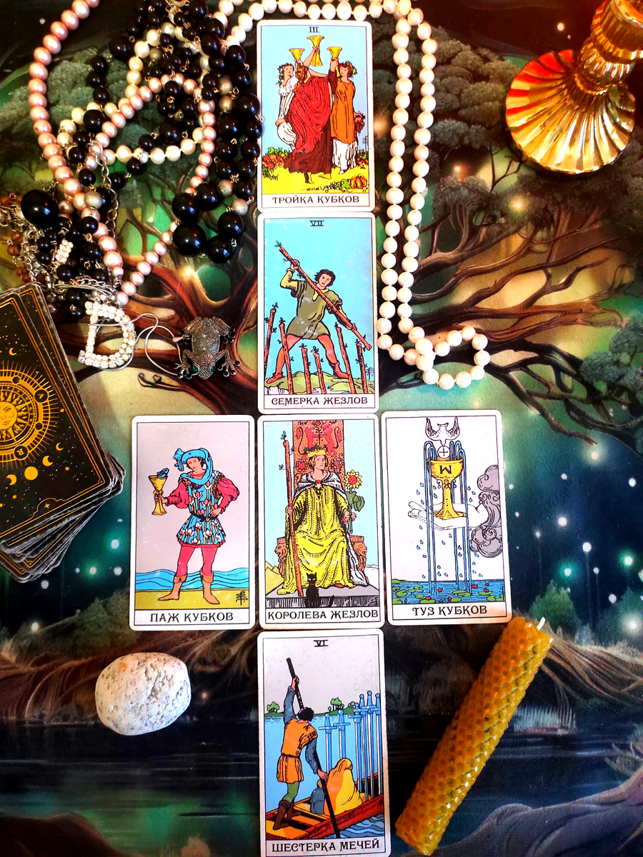 Расклад показывает неделю гармоничного баланса между твёрдостью и мягкостью. Защищая свои рубежи (7 Жезлов), не закрывайте сердце для новых чувств (Паж Кубков) и радости общения (3 Кубков). Ваша деловая активность (Королева Жезлов) получит позитивный эмоциональный заряд (Туз Кубков), что в итоге позволит вам совершить плавный, но важный переход (6 Мечей) в мышлении или обстоятельствах.
