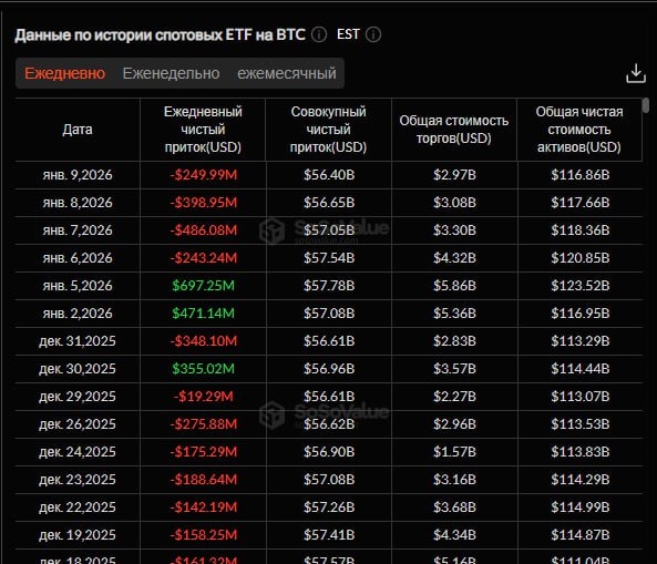 🔸9 января спотовые биткоин-ETF зафиксировали общий чистый отток средств в размере $250 млн