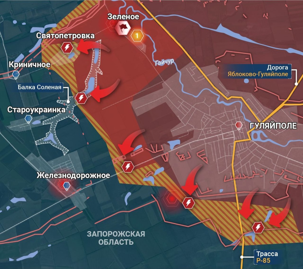 Севернее Славянска ВС РФ не ограничились прорывом в Святогорск, но и завязали бои уже на окраинах Александровки и поселка Сосновое. … … правый берег Гайчура. Там наши не только подошли к Железнодорожному /Зализныче/ и освободили Зеленое, но и освободили Прилуки. А заодно взяли в клещи Святопетровку. … … на Константиновском направлении продвигаются и южнее, от Кл-Б. в/х, и восточнее, и в самом городе. На юге заняли опорник на бывшем посту ГАИ и вплотную подошли к Берестку и Ильиновке. Сразу за ними – южные и ЮЗ окраина Константиновки. К востоку же нам кровь из носа надо освободить Николаевку, вплотную примыкающую к ЧЯ и освобожденную впервые 13 июля прошлого года. Это позволит ликвидировать карман южнее Веролюбовки и более широким фронтом идти на запад. Пока же… идут бои в Веролюбовке и расширяется зона контроля севернее … Майского. ВС РФ здесь с юга подходят к Марково, впервые осв-го 5 сентября. Вообще, эти осв-ия авансом, еще до закрепления в н.п. и их полной зачистки здорово вредят м