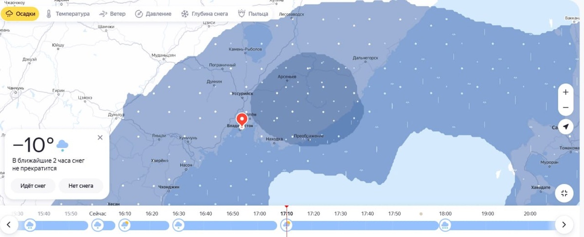 📌📌📌 Снег во Владивостоке прекратится только к ночи, по данным карты осадков «Яндекс Погоды», возможно даже усиление в районе 18:00–19:00