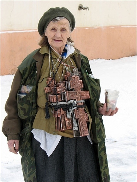Бабе Нине за семьдесят, из них около тридцати лет она носит свои кресты и как минимум десять лет живет у нас в детском клубе «Ковчег». Дети, которые приходят в студии, на нее реагируют нормально, называют «бабушка Нина», и при первом знакомстве спрашивают ее: «А зачем вам столько крестов?», на что обычно слышат что-то типа «А как же иначе нашим солдатикам денежки с Тихого океана вывозить?!»