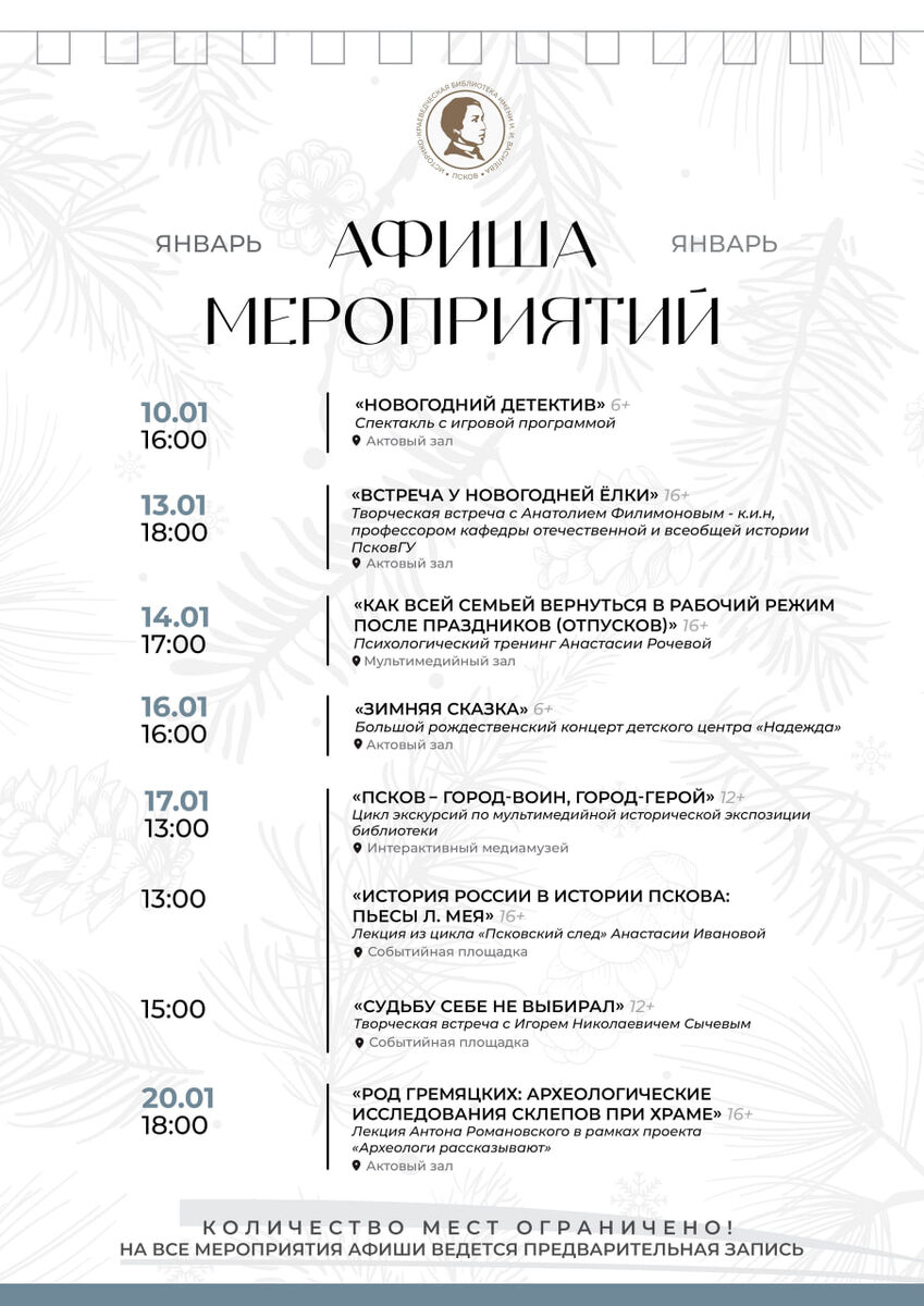 Афиша мероприятий библиотеки имени И.И. Василёва в Пскове на январь 📚