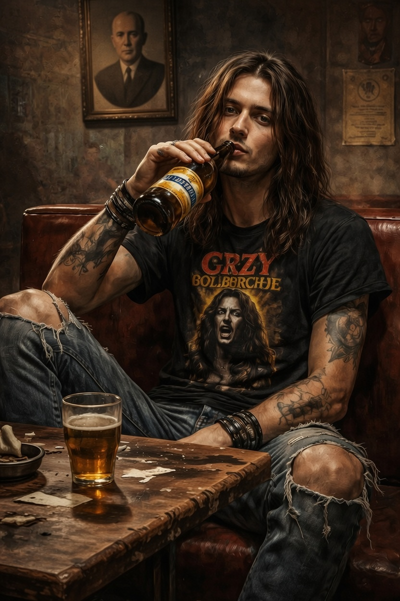 Рваные джинсы, футболка с Оззи Осборном, татуировки с черепами.