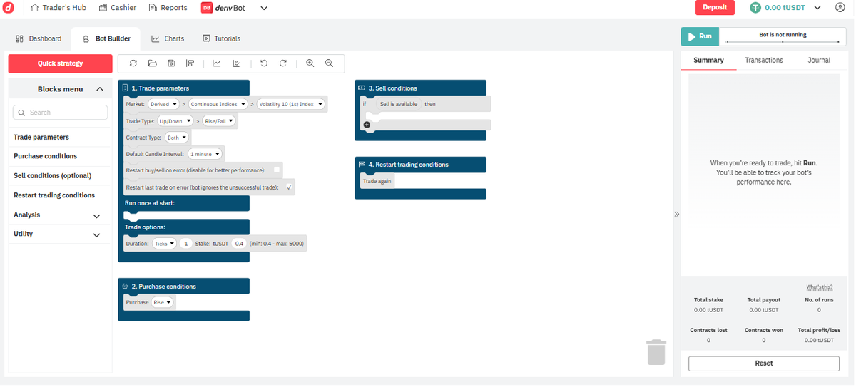 Интерфейс DBot построен на базе визуального программирования (Blockly), где каждая функция — это отдельный блок, который вы просто перетаскиваете на рабочее поле. Это дает вам полный контроль над каждым аспектом вашей стратегии. Система разделена на четыре основных этапа, которые проходит ваш робот: