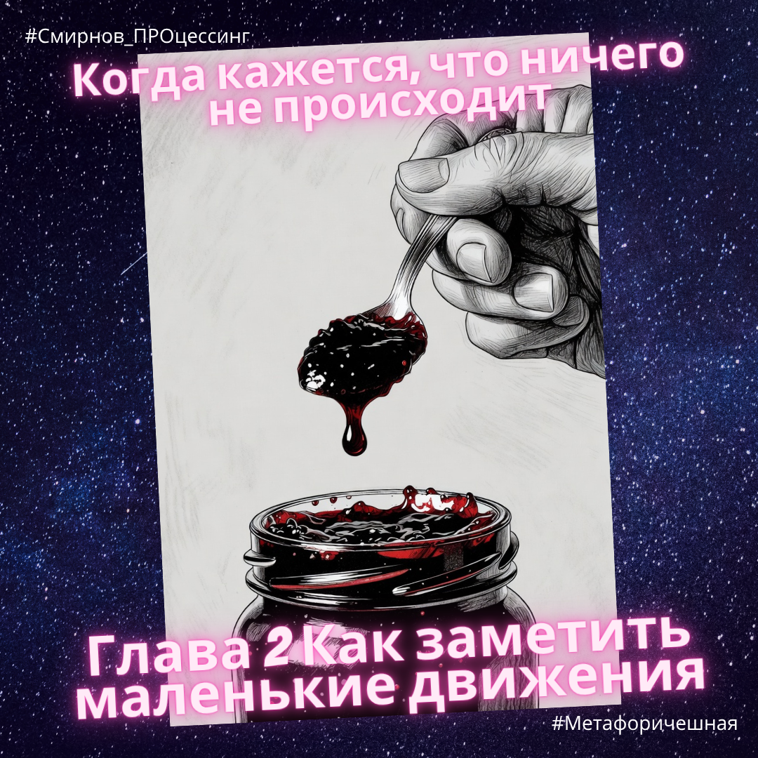 10.01.2026 Глава 2 Как заметить маленькие движения На следующей неделе Тим пришёл к Луке чуть бодрее — но всё равно с тем же вопросом в глазах: «Ну и что теперь?» — Лука, — начал он с полудраматичным вздохом, — ты говорил, что внутри идёт работа. Хорошо. Пусть идёт. Но… почему я её не чувствую? Почему всё вокруг такое… одинаковое? Ничего ведь не меняется. Лука, как обычно, не спешил отвечать. Он открыл банку варенья, которую принесла соседка, поставил на стол две ложки и спокойно сказал: — Сядь. Сейчас будем ловить движения. — Вареньем? — Тим подозрительно прищурился. — Именно. — Лука улыбнулся. — Смотри. Он положил себе на ложку немного варенья, поднял к свету и сказал: — Ты думаешь, что движение — это когда тебя бросает от великих инсайтов к свершениям. А на самом деле движение — это когда ты хотя бы на секунду чувствуешь: «Я здесь». Тим неуверенно взял свою ложку. — И как мне это… почувствовать? — Начнём с простого, — сказал Лука. — Вспомни вчерашний день. Была ли хоть одна маленьк