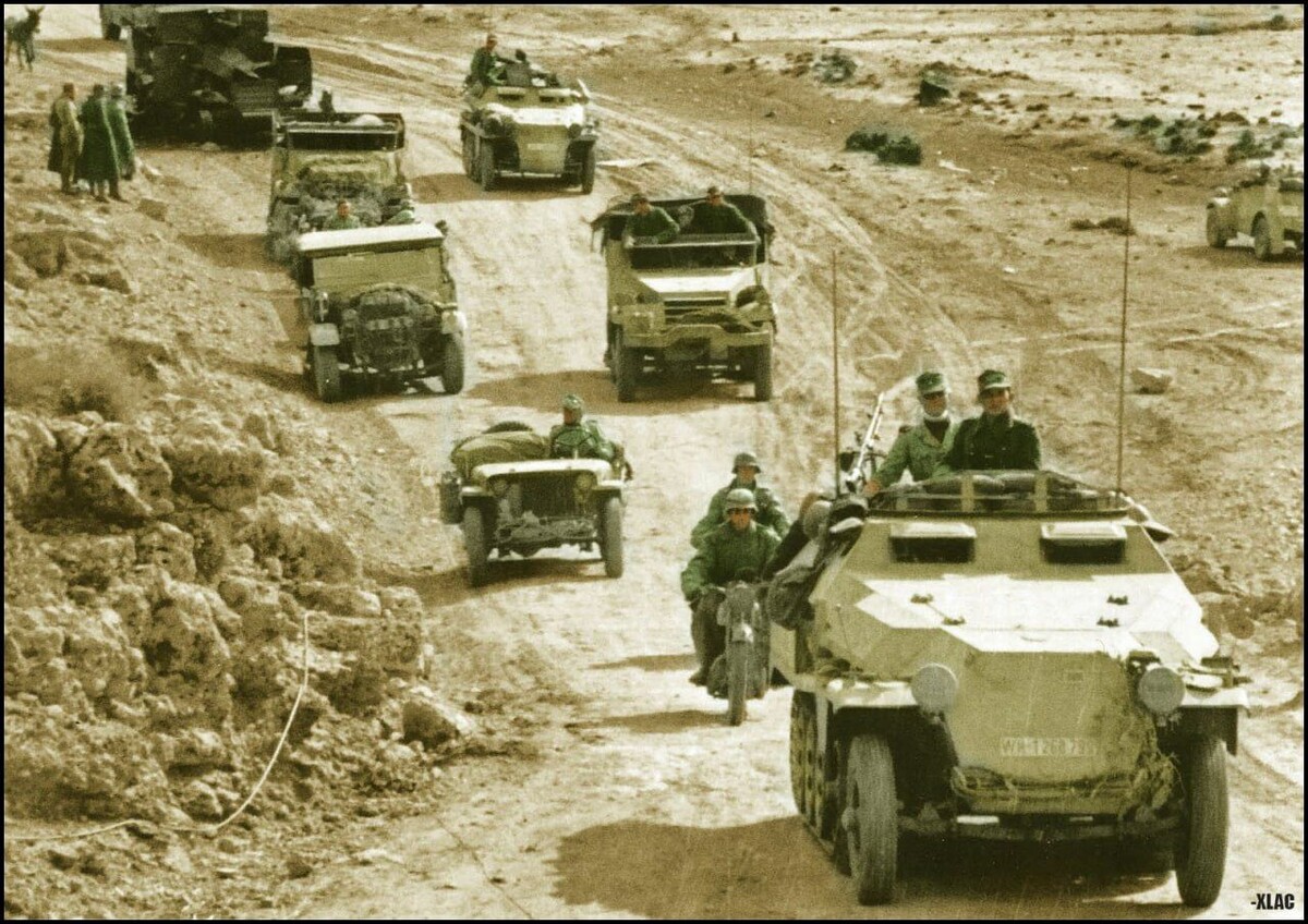Колонна бронетранспортёров из состава 10-й танковой дивизии Африканского корпуса на марше. Тунис, Северная Африка.