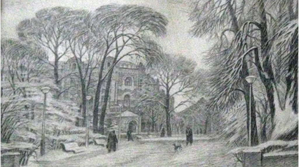 На карандашном рисунке автор показа заснеженную аллею «круглого», выходящую в сторону улицы Фокина. В композицию включена часть исторического здания бывшей женской гимназии.