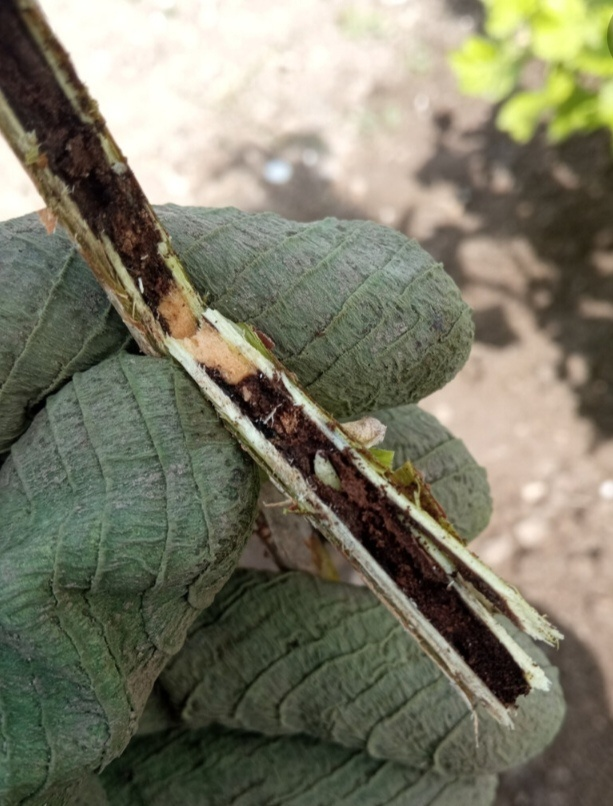 Все знают, что побеги смородины увядают и отмирают потому, что внутри них живет личинка бабочки стеклянницы. Вытащить личинку из побега невозможно, но можно ее уничтожить системным препаратом, путем полива под корень, например, Актарой. При этом, борьба со стеклянницей должна быть комплексной, чтобы разорвать круг заражения.