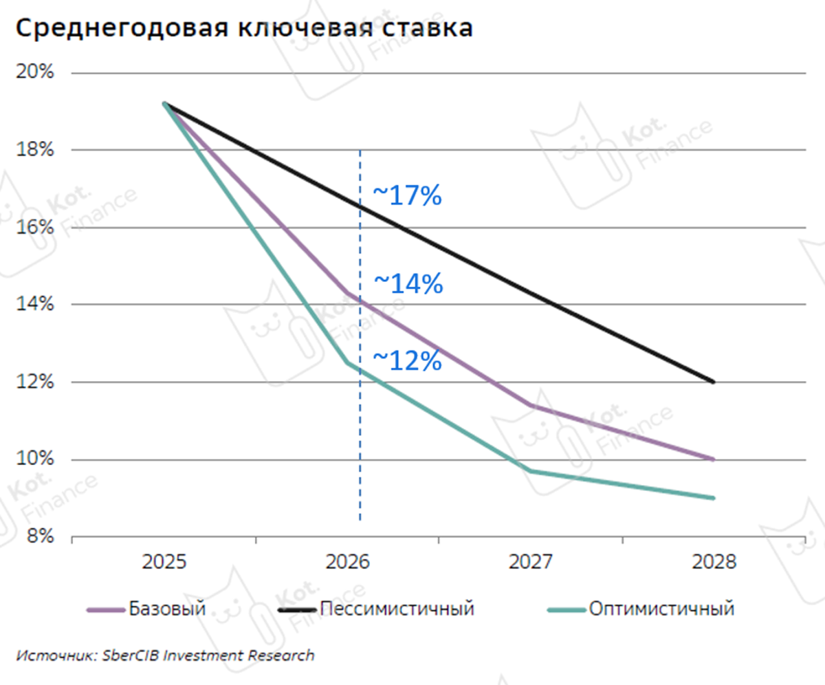 ИИ портфель от Sber CIB, интересный прогноз по валюте. Есть вероятность, что ключевую ставку могут и не опустить. Что ждёт Сбер от 2026 года? На чём базируется прогноз 🔹Замедление инфляции к цели 4% после краткого всплеска в начале года (эффект НДС) 🔹Снижение ключевой ставки ЦБ РФ с ~16% к 12% к концу 2026 🔹Сокращение валютного предложения (экспорт, операции ЦБ) + рост спроса на валюту 🔹Давление на нефть (профицит рынка), но устойчивый спрос на золото 🔹Геополитика - ключевой риск, но вероятность «разрядки» выросла до 20% 👉 Аналитики тоже ошибаются Главная идея: фиксированный купон лучше флоутеров 🔹Доходности будут снижаться → рост цен на облигации 🔹Фаворит - длинные ОФЗ (7–10 лет), особенно при базовом сценарии 🔹Корпоративные облигации интересны, но избирательно: процентное покрытие слабое, кредитный риск высок Коротко: в рамках базового прогноза Сбер ждет ставку 12% на конец года, 3400 по индексу MOEX, 100 рублей за доллар Оптимистичный прогноз: ставка 10%, 3700 индекс МосБир