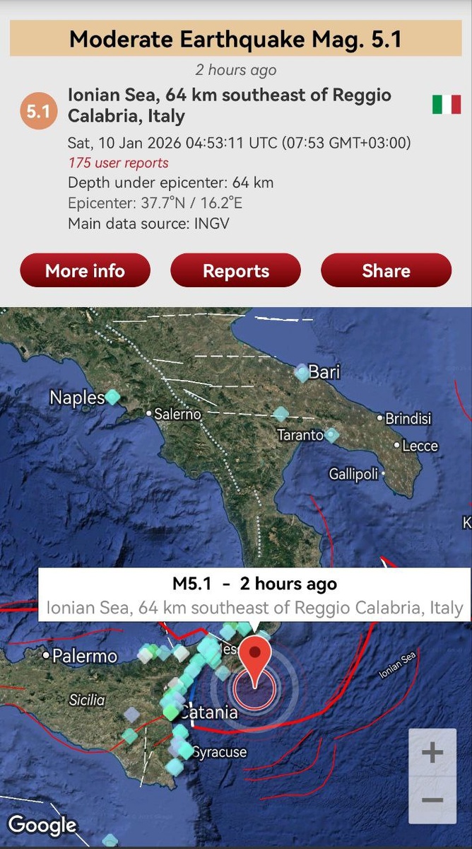Через 8 дней после предупреждения произошло умеренное ощутимое землетрясение к югу от Италии