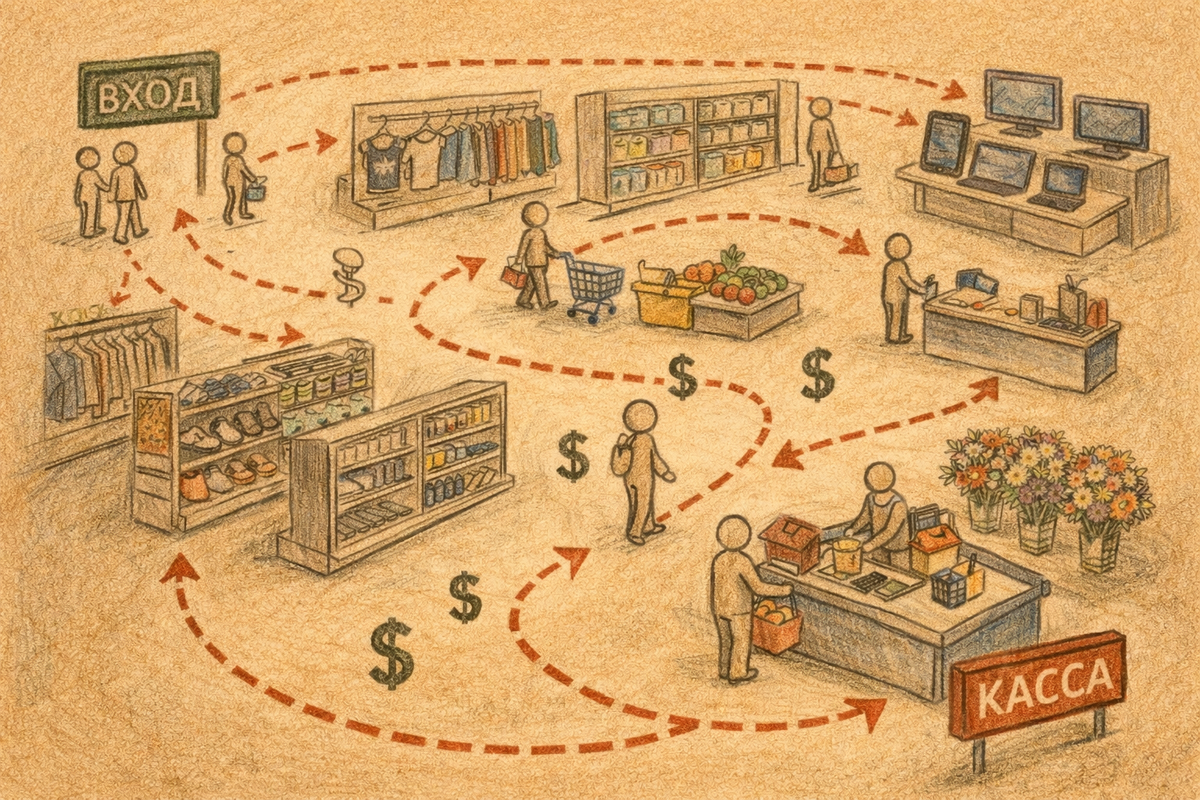 Планирование магазина обычно начинается одинаково. Есть помещение. Есть бюджет. Есть великая идея «сделаем красиво, а продажи как-нибудь сами». На этом месте можно сразу ставить крест, но люди упрямые, любят учиться через боль. Магазин - это не интерьер из Pinterest и не повод для гордости перед друзьями. Это инструмент по выкачиванию денег из проходящего мимо трафика. Всё остальное вторично, включая ваше эстетическое чувство и мнение дизайнера, который в жизни ничего не продавал. Первое, что надо учитывать, — поток. Не «локация хорошая», не «рядом метро», а куда реально идут люди, откуда заходят, где тормозят и где разворачиваются. У магазина есть естественные маршруты движения, и если вы их игнорируете, то половину ассортимента можно сразу отнести на склад и не мучить. Золотое правило простое: клиент не должен думать, куда ему идти. Он должен идти туда, куда вы его толкаете. Если вход, касса и ключевые витрины живут своей жизнью - это не магазин, а квест «найди выход с покупкой»