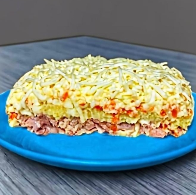 Такой салат готовится быстро и просто, идеально подходит для семейных ужинов или праздников. Благодаря своим ингредиентам, он получается сытным, ароматным и привлекательным внешне. Дайте салату настояться несколько часов перед подачей на стол, чтобы слои успели хорошо пропитаться, и наслаждайтесь каждым кусочком!