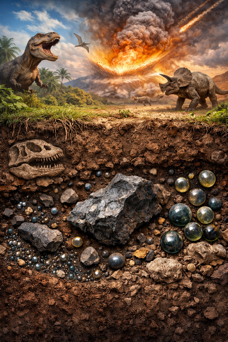 Во время удара расплавленные породы и частицы самого астероида были выброшены на тысячи километров. Эти микроскопические обломки разлетелись по всей планете и осели тонким слоем в почве и горных породах.