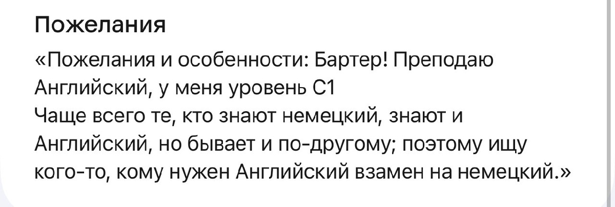 🌞 Дорогие Учителя, как относитесь к занятиям по бартеру? С нами делится своим мнением репетитор Английского языка: «Считаю, что бартер=бесплатная работа. Далеко не всегда усилия, затрачиваемые на такие занятия, являются равноценными с двух сторон. К примеру, я занималась испанским в обмен на английский: я готовилась к урокам, старательно подбирала материал, а другой репетитор тупо шел по учебнику»