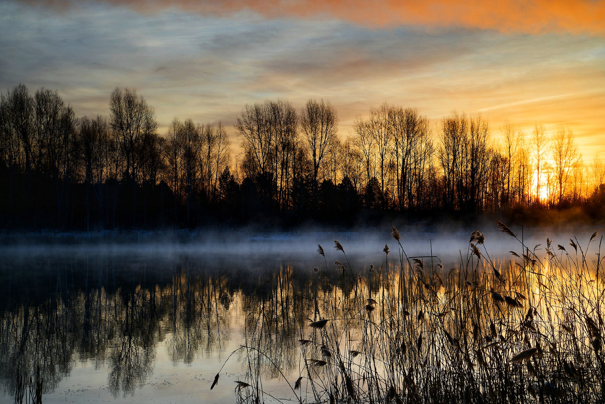 Ранним январским утром, когда еще только первые лучи солнца начинают пробиваться сквозь густую стену темного зимнего леса, природа оживает по-особенному ярко и эффектно. На берегу незамёрзшей Сибирской реки, окутанной утренним туманом, царит таинственная атмосфера. Солнце медленно поднимаетсяиз-за вершин деревьев, окрашивая холодный туман и воду в нежные розовые и золотые оттенки. В воздухе витает свежесть, которая вместе с утренним морозом бодрит и наполняет энергией. Вдоль берега реки замерзает рогоз. Его высокие стебли, покрытые инеем, создают причудливые контрастные картины на фоне светлеющего неба. Каждый листочек, каждая травинка будто замирает в ожидании чего-то нового, что принесёт с собой наступивший день. Зимний лес в утренние рассветные часы особенно красив. Он словно неспешно просыпается от долгого зимнего сна, готовясь к новому щедрому до красок дню. Солнечные лучи, пробивающиеся сквозь ветви, создают игру света и тени, делая пейзаж ещё более живописным. Это мгновение — с
