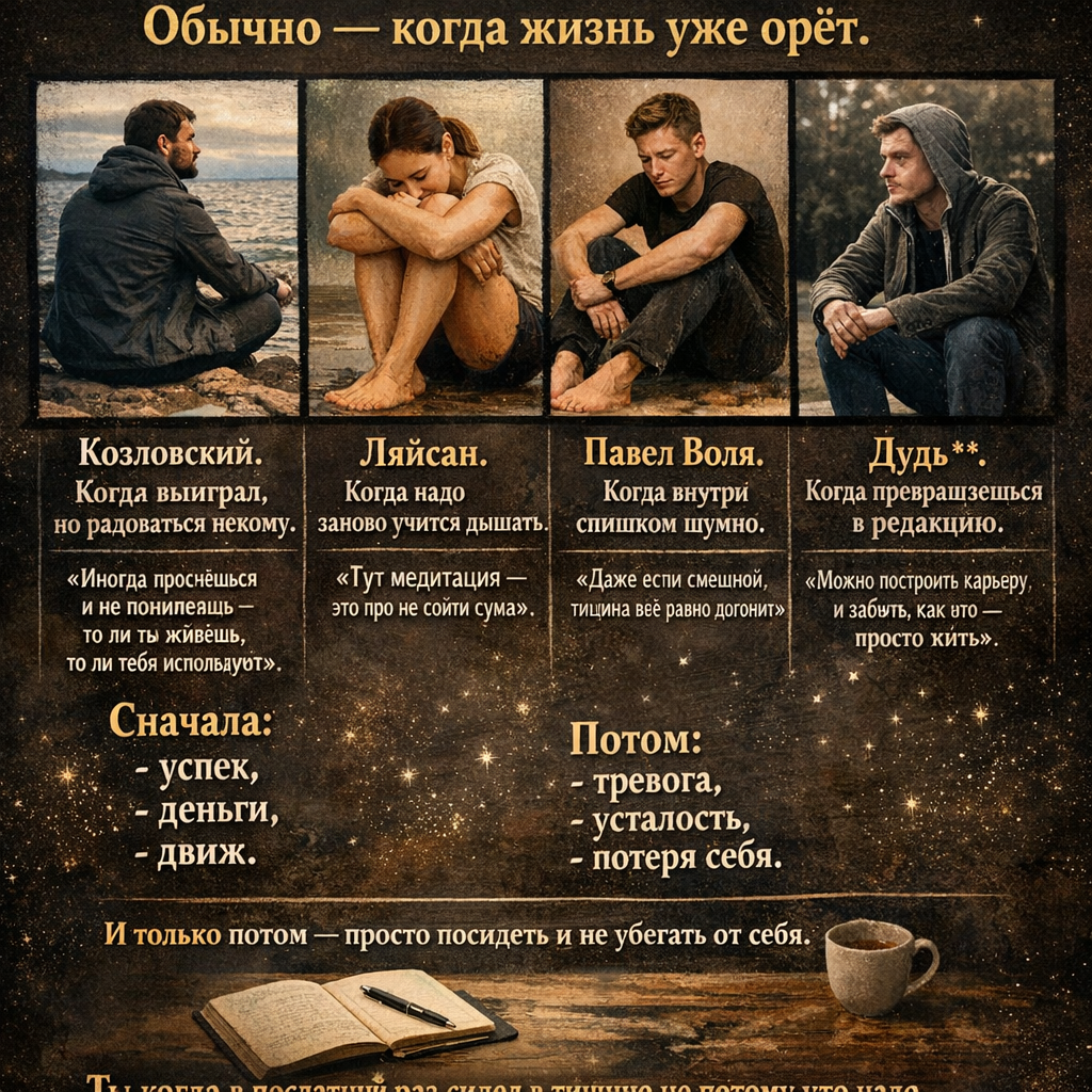 На практике к ней приходят взъерошенные, уставшие и слегка поломанные. Я это вижу не только по звёздам. Я это вижу по обычным людям. Сначала человек гордится тем, что «может не спать». Потом — тем, что «хотя бы иногда не трясётся». Со звёздами всё просто: у них ломка происходит публично. У Козловского была странная фаза. Он был везде. Его было слишком много. И в какой-то момент стало заметно: человека в этом успехе меньше, чем проектов. В одном интервью он обронил фразу, которая меня тогда зацепила: мол, иногда просыпаешься и не понимаешь — это ты живёшь или тебя просто используют как инструмент. Знаешь это ощущение? Когда ты вроде бы на своём месте, но внутри — как в съёмной квартире. Он начал уезжать один. Без съёмок. Без команды. Просто сидеть и молчать. Не потому что модно. Потому что по-другому уже не получалось. Раньше он жил как будто на постоянном кастинге.