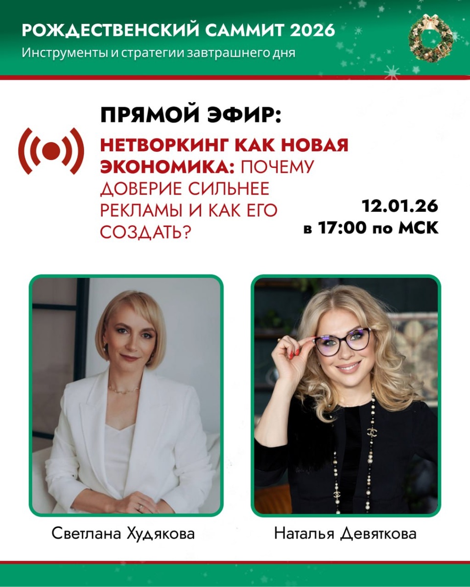 ? САМЫЙ ЦЕННЫЙ АКТИВ – ЭТО ЛЮДИ! И именно нетворкинг может стать тем самым нужным рычагом для развития бизнеса и вашего роста. Друзья! «Рождественский саммит» - идеальная платформа, чтобы открыть двери к новым возможностям, партнерствам и коллаборациям. 📊Сотни качественных перспективных проектов реализуются прямо сейчас по всей России и на территории стран-партнеров. И это стало возможно, благодаря силе нетворкинга! Продолжаем серию полезных прямых эфиров к 🟢 XI РОЖДЕСТВЕНСКОМУ САММИТУ в Тюмени. 🔴12 января 17.00 (мск) Про движущую силу развития бизнеса - НЕТВОРКИНГ расскажет 🟢СВЕТЛАНА ХУДЯКОВА директор учебного центра «Скрижаль», антикризисный менеджер, бизнес-тренер по управленческой эффективности, создатель самого большого делового сообщества Урала и Сибири «Нетворкинг с Худяковой» количеством 3600+ участников. Поговорим о самом важном: ▪️ нетворкинг - что это: тренд или «поиск полезных связей»? ▪️ как обмен опытом позволяет экономить время и ресурсы ▪️ как превращать довери