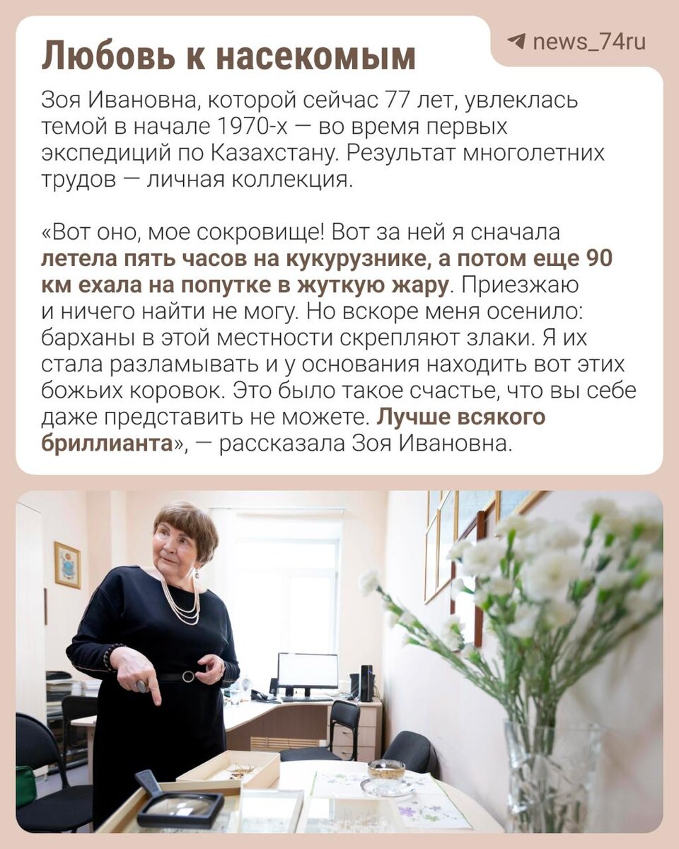 Зоя Ивановна Тюмасева из Челябинска — один из самых крупных российских специалистов в области изучения божьих коровок. Она открыла 52 вида божьих коровок в Западном Казахстане, о которых никто в мировом научном сообществе даже не догадывался. На Урале ею описано еще 72 вида и опубликована монография. Мы узнали у профессора, почему этих коровок называют божьими, как она сама относится к религии и что думает об образовании и нехватке учителей в школах ⬆️