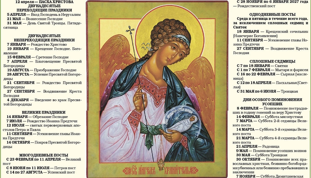 Православный календарь на 2026 год 12 апреля – ПАСХА ХРИСТОВА ДВУНАДЕСЯТЫЕ ПЕРЕХОДЯЩИЕ ПРАЗДНИКИ 5 АПРЕЛЯ – Вход Господень в Иерусалим 21 МАЯ – Вознесение Господне 31 МАЯ – День Святой Троицы. Пятидесятница ДВУНАДЕСЯТЫЕ НЕПЕРЕХОДЯЩИЕ ПРАЗДНИКИ 7 ЯНВАРЯ – Рождество Христово 19 ЯНВАРЯ – Крещение Господне. Богоявление 15 ФЕВРАЛЯ – Сретение Господне 7 АПРЕЛЯ – Благовещение Пресвятой Богородицы 19 АВГУСТА – Преображение Господне 28 АВГУСТА – Успение Пресвятой Богородицы 21 СЕНТЯБРЯ – Рождество Пресвятой Богородицы 27 СЕНТЯБРЯ – Воздвижение Креста Господня 4 ДЕКАБРЯ – Введение во храм Пресвятой Богородицы ВЕЛИКИЕ ПРАЗДНИКИ 14 ЯНВАРЯ – Обрезание Господне 7 ИЮЛЯ – Рождество Иоанна Предтечи 12 ИЮЛЯ – святых первоверховных апостолов Петра и Павла 11 СЕНТЯБРЯ – Усекновение главы Иоанна Предтечи 14 ОКТЯБРЯ – Покров Пресвятой Богородицы МНОГОДНЕВНЫЕ ПОСТЫ С 23 ФЕВРАЛЯ по 11 АПРЕЛЯ – Великий пост С 8 ИЮНЯ по 11 ИЮЛЯ – Петров пост С 14 по 27 АВГУСТА – Успенский пост С 28 НОЯБРЯ по 6 ЯНВАРЯ 2027 года