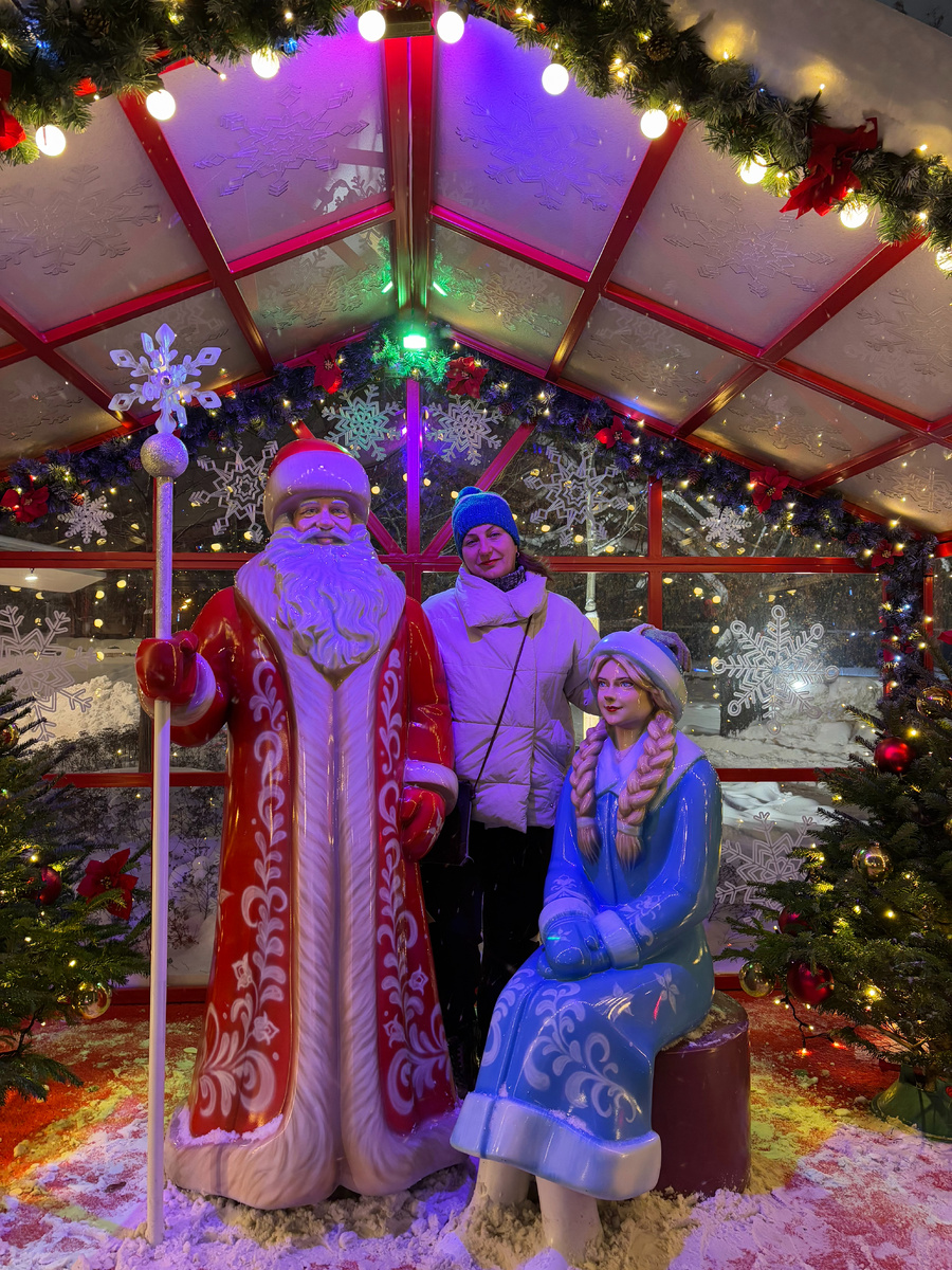 Уже у пешеходного перехода ждала ещё одна сказочная локация — застывшие в красивой позе Дед Мороз и Снегурочка. Перейдя дорогу, мы оказались у знаменитого эскалатора, ведущего на станцию метро «Воробьёвы горы». Весь этот волшебный круг — от катка до метро — занял чуть больше часа, но впечатлений хватило на всю долгую зимнюю ночь.
