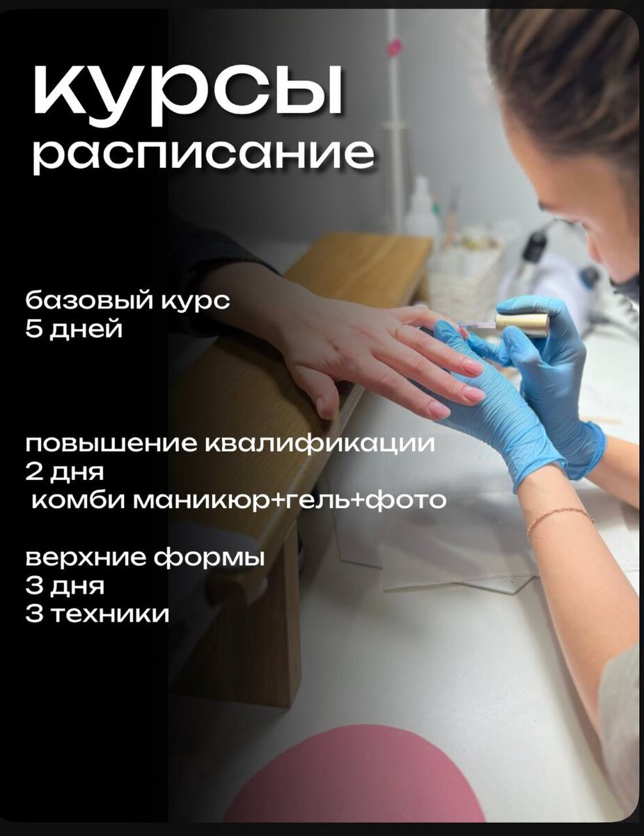 : 2 по 6 БАЗОВЫЙ КУРС МАСТЕР С 0. До старта практики изучение онлайн теории с доступом навсегда. После курса выдается диплом , настенный диплом, методические пособия. Стоимость 25.000 (без наращивания ногтей) Стоимость 30.000 (с темой и практикой по наращиванию ногтей) 10 по 12 КУРС ВЕРХНИЕ ФОРМЫ. 3 техники моделирования. Онлайн теория с доступом на год. Выдается диплом , рабочая тетрадь со схемами. Стоимость 15.000 16-17 ПОВЫШЕНИЕ КВАЛИФИКАЦИИ Чистое комби без порезов + работа гелем тонко без отслоек + уроки по фото работ. Выдается диплом Стоимость 12.000