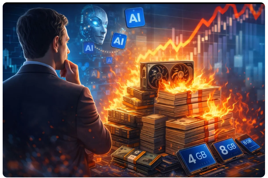 Сейчас об искусственном интеллекте говорят так, будто он уже всё понял, всё решил и завтра выйдет на работу вместо нас. Акции компаний с приставкой AI в презентации улетают в космос, аналитики рисуют экспоненты, инвесторы кивают, рынок аплодирует стоя. Где-то по дороге подорожала оперативная память, а новые компьютеры внезапно начали продаваться с 8, а иногда и с 4 гигабайтами ОЗУ, как будто на дворе снова 2012 год и браузер ещё не научился есть память ложками. И вот тут появляется очень неприятный текст, от которого хочется отвести взгляд, но именно его и стоит читать внимательно. Суть простая и от этого особенно некомфортная. Огромные объёмы оперативной памяти были куплены за деньги, которых ещё нет, под GPU, которые ещё не произведены, чтобы установить их в дата-центры, которые ещё не построены, и запитать инфраструктурой, которая, возможно, вообще никогда не появится. Всё это ради спроса, который уже заложен в моделях, но в реальности пока существует в основном в презентациях и тв
