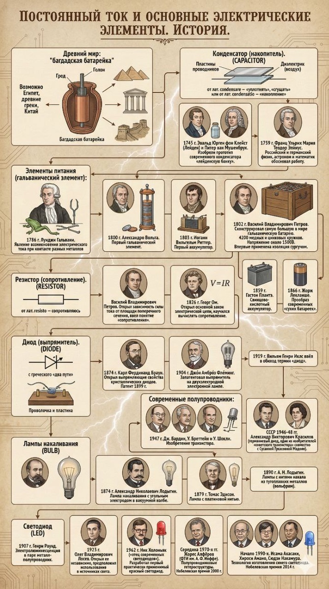 древности. Похожие гипотезы существуют относительно технологий Древнего Египта, Греции и Китая, хотя официальная наука ведет отсчет с XVIII века. КОНДЕНСАТОР (CAPACITOR) Название происходит от латинского condensare — «уплотнять». - 1745 год: Эвальд Юрген фон Клейст (Германия) и Питер ван Мушенбрук (Нидерланды) независимо друг от друга создали «лейденскую банку» — первый накопитель электрического заряда. - 1759 год: Физик Франц Эпинус научно обосновал принцип работы устройства, применив плоские обкладки. - На схемах компонент обозначается как две пластины проводников, разделенные слоем диэлектрика. ЭЛЕМЕНТЫ ПИТАНИЯ И АККУМУЛЯТОРЫ - 1786 год: Луиджи Гальвани (Италия) открыл возникновение тока при контакте металлов с мышцами препарированной лягушки. - 1800 год: Алессандро Вольта (Италия) создал «Вольтов столб» — первый в истории химический источник тока. - 1802 год: Василий Петров (Россия) сконструировал гигантскую батарею из 4200 пар дисков. Он первым применил изоляцию сургучом и по