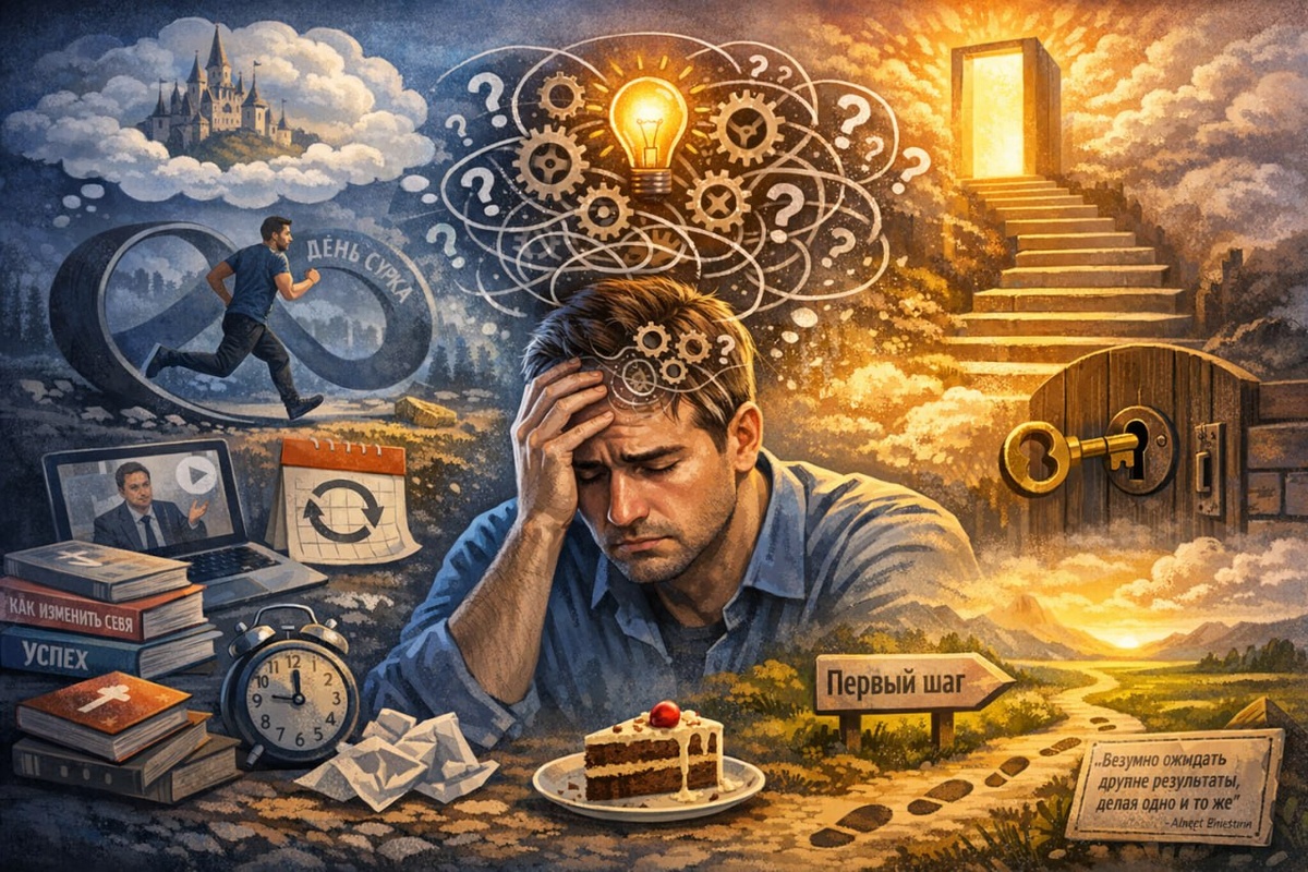 Этот вопрос я раньше очень часто себе задавал. Читал много книг, слушал "продвинутых" людей, смотрел умные видео. И вроде всё верно написано в книгах и говорят люди, слова прям про меня. Понимаешь, что нужно жить и думать по-другому. Но проходит день, неделя, год — и ничего особо не меняется. Те же разговоры. Те же реакции. Тот же результат. И внутри такое ощущение как будто ты застрял(а) в дне сурка. И в какой-то момент сам себе задаёшь вопрос: «Что со мной не так, почему я всё понимаю — но в жизни ничего не меняется?» Вы уже достаточно взрослый человек, чтобы не верить в сказки. Вы не ждёте волшебной таблетки. Вы просто хотите простого ответа. Потому что жизнь меняется не там, где мы думаем. Понимание ситуации, смена мышления, новые установки это всё прекрасно. Но это всё вотчина ума. А он может годами и десятилетиями заниматься тем, что будет гонять вас по кругу, говоря, что для изменений нужно добавить ещё чуть-чуть: знаний, техник, мотивации. Проблема в том, что природа ума - блуж