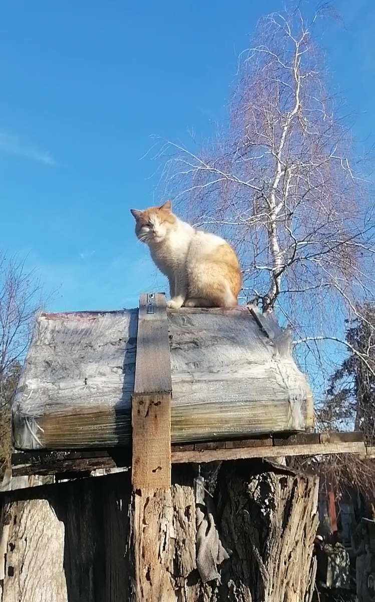 - Обнаружила сегодня нашего местного авторитета в новой, крайне живописной резиденции. Высокий пенёк. На пеньке — дом. На доме — крыша. На крыше — он. Смотрит на свои владения, как с обзорной башни.