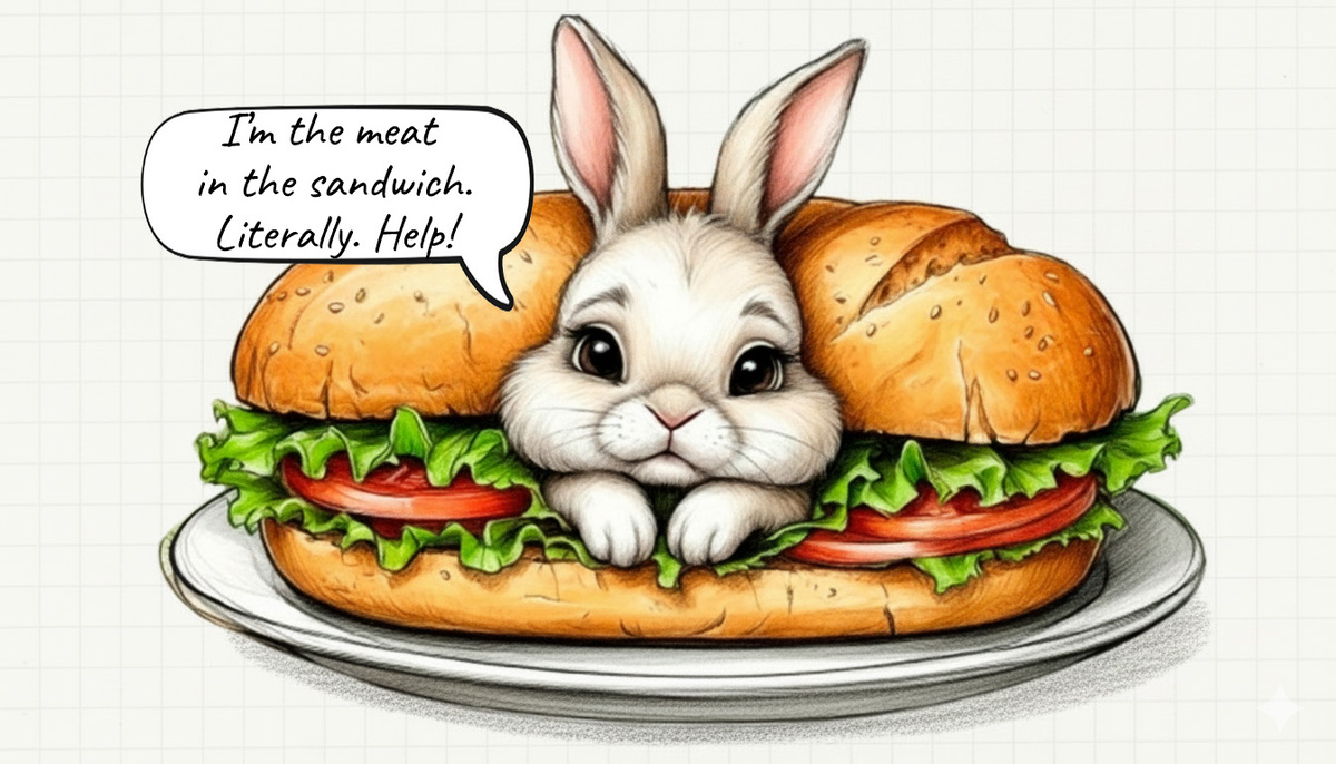 Эта фраза дословно переводится как «быть мясом в сэндвиче». Как и в предыдущих выражениях, здесь используется аналогия с бутербродом, чтобы описать ситуацию, когда кто-то зажат между чем-то.