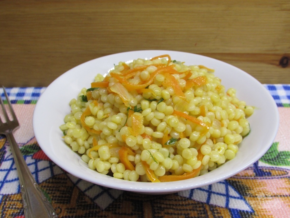 Итак, соберем простой и доступный набор для приготовления птитим с овощами в домашних условиях. Приступим! Очистите, сполосните и произвольными кусочками порежьте морковь. Обжаривайте ее на разогретой сковороде с растительным маслом. К моркови добавьте лук, очистив его от шелухи и промыв. Лук режем мелкими кубиками. Теперь очередь чеснока. Зубчики его освободите от шелухи и сполосните. Порежьте, прибавьте к остальным овощам. Готовим все, помешивая, несколько минут. Когда овощи размягчились совсем немного, можно добавлять птитим. Его промывать перед готовкой не надо, хоть он и напоминает крупу. Засыпьте пасту в сковороду. Залейте стаканом воды. Горячей или холодной, не имеет значения. Я для ускорения процесса всегда беру воду из только что закипевшего чайника. Накройте сковороду крышкой и готовьте пасту на медленном огне около 15 мин. Посолим. Я приправляла блюдо пряной солью, она дает дополнительные ароматные оттенки всему блюду. Добавьте немного воды, перемешайте овощи и пасту. Чуть-