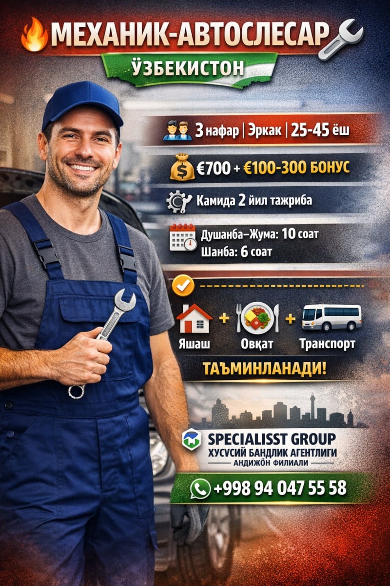 🔥 МЕХАНИК-АВТОСЛЕСАР 🔧 📍 Мамлакат: Ўзбекистон 👤 Сони: 3 нафар 👨🔧 Жинс: Эркак 🎂 Ёш чегараси: 25–45 ёш 💰 Маош: 700 € 🎁 Бонус
