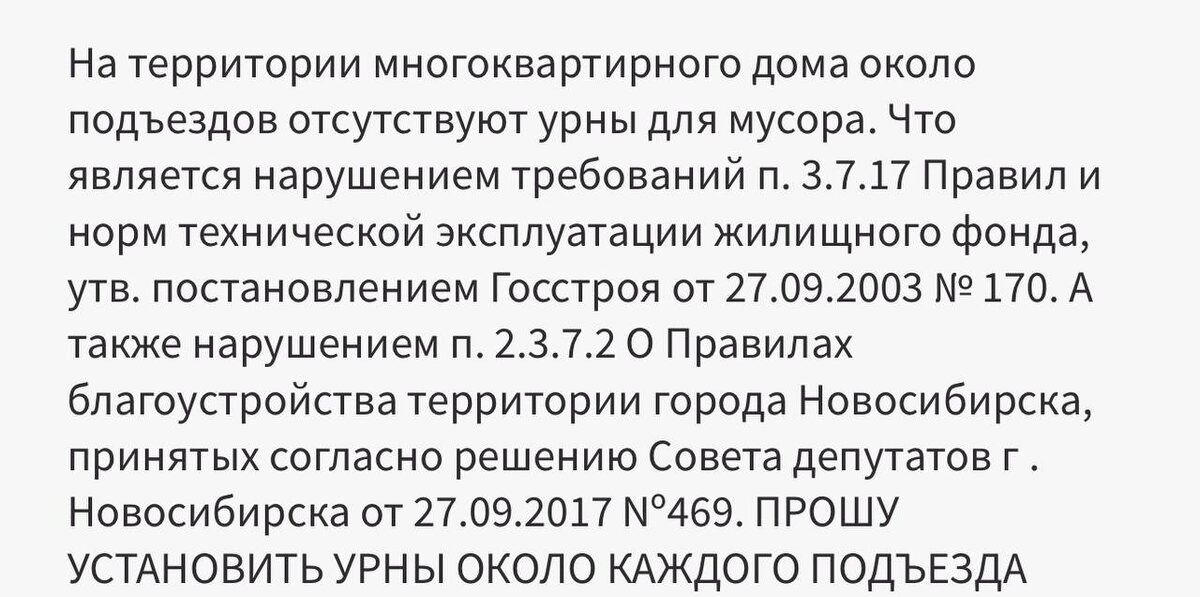 Новосибирск. Речь про обычные урны у подъездов. Точнее, про их отсутствие. По закону и нормам мусорки, вероятно, там стоять обязаны. Я, как положено, закинул обращение через «Госуслуги.Решаем вместе». И что вы думаете? Ответили: мол, субсидий управляйке не дали, «наказов от избирателей» не было. Смотрю и думаю: при чем тут субсидии и наказы, если есть правила, которые коммерческая организация обязана соблюдать сама? Меня это, честно говоря, задевает. Частная компания правила нарушает, надзорные органы их не штрафуют, про какие-то субсидии рассуждают. Почему нельзя просто заставить управляющую компанию выполнять свою работу - большой вопрос. Грустно, что за каждую мелочь приходится бодаться и тратить кучу времени. Ради просто возможности во дворе наконец фантик не в карман класть, а в урну. Может, уже пора передать все управление государству или внедрить автоматические штрафы? Чтобы система сама видела нарушения и била рублем без обращений от жителей.