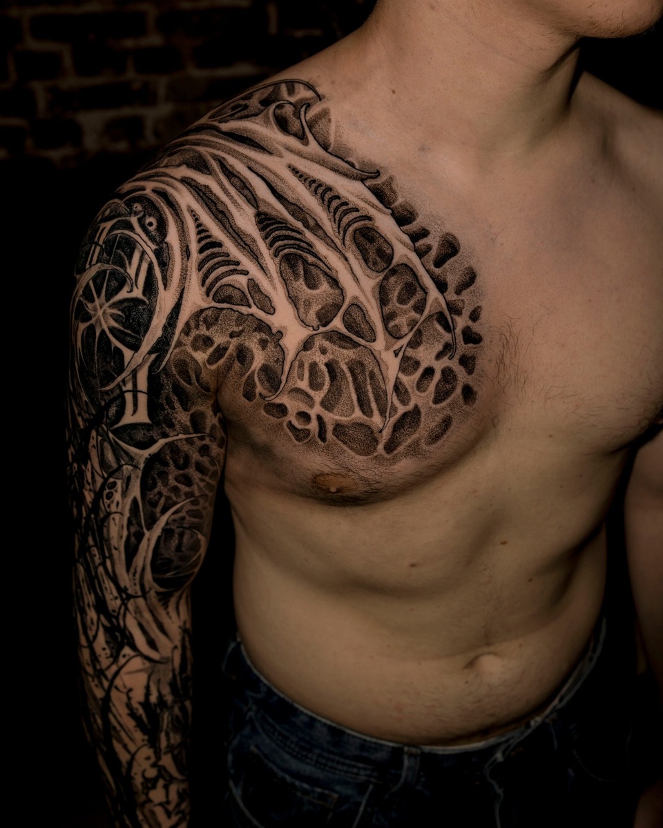 ? Про то, зачем люди их делают и что за этим стоит? Вот здесь — часть рукава. Основа была сделана не мной, я просто заполнил пустые места и собрал всё в одно целое. Иногда тату — это не про новую картинку, а про завершение истории. А для вас тату — это про что?