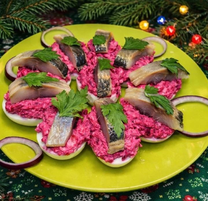 ИНГРЕДИЕНТЫ: ✅ Филе сельди — 1 шт ✅ Картофель — 2 шт ✅ Свёкла — 2 шт ✅ Морковь — 1 шт ✅ Яйца — 6 шт ✅ Лук репчатый — 1/2 шт ✅ Майонез — 3 ст. л. ✅ Соль, чёрный перец — по вкусу ✅ Петрушка — для украшения ПРИГОТОВЛЕНИЕ: 1. Яйца отварить вкрутую, полностью остудить и очистить. Аккуратно разрезать поперёк, вынуть желтки и переложить их в миску. 2. Картофель, морковь и свёклу отварить до готовности, остудить и натереть на крупной тёрке. 3. Лук мелко нарезать. Мариновать не нужно — он отлично подходит в свежем виде. 4. К желткам добавить натёртые овощи и лук. Посолить, поперчить по вкусу, заправить майонезом. 5. Тщательно перемешать до однородной, нежной массы — начинка готова. 6. Филе сельди нарезать небольшими порционными кусочками. 7. Наполнить половинки яичных белков овощной начинкой. 8. Сверху на каждое фаршированное яйцо выложить кусочек сельди. 9. Украсить закуску петрушкой или другой зеленью по желанию. СОВЕТЫ: ✅ Овощи можно отварить заранее — закуска собирается за считан