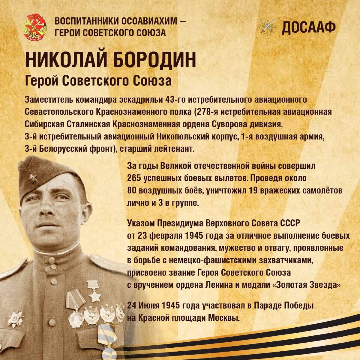 : Бородин Николай Васильевич Бородин Николай Васильевич — летчик-истребитель, Герой Советского Союза, выпускник Читинского аэроклуба ОСОАВИАХИМа. Родился в 1919 году в Забайкалье. После семилетки работал на руднике и в железнодорожном депо, затем окончил аэроклуб, что стало началом его военного пути. В 1939 году призван в армию, позже окончил Харьковскую и Вознесенскую авиационные школы. С 1943 года принимал участие в боевых действиях в составе 43-го истребительного авиационного полка. Летал на Як-7 и Як-9, выполнял сопровождение, разведку и штурмовые задачи на Северо-Кавказском, Южном, Украинских и Белорусских фронтах. Боевые результаты: • более 260 боевых вылетов • около 80 воздушных боёв • 19 самолётов противника сбито лично, 3 — в группе За отличие в боях награждён орденами Красного Знамени, Отечественной войны, Александра Невского, Красной Звезды. Указом Президиума Верховного Совета СССР от 23 февраля 1945 года удостоен звания Героя Советского Союза. После войны продолжил слу