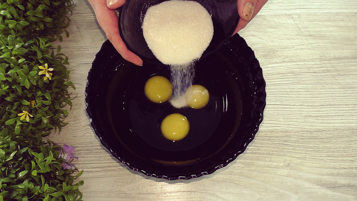 В миску с яйцами добавить щепотку соли, сахар и перемешать.