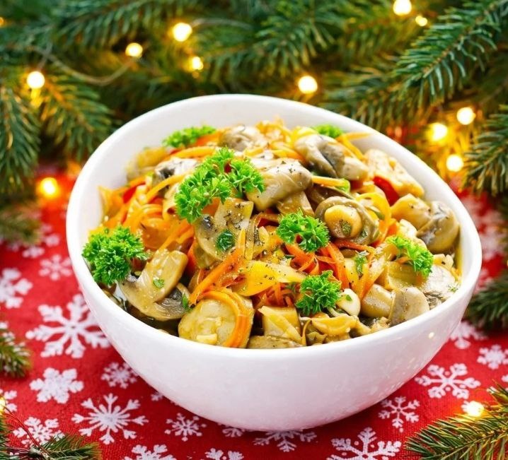 ИНГРЕДИЕНТЫ (4 порции): ✅ Шампиньоны — 500 г ✅ Болгарский перец — 1 шт. ✅ Лук — 1 шт. ✅ Морковь — 1 шт. ✅ Чеснок — 3 зубчика ✅ Петрушка — по вкусу ✅ Соевый соус — 2 ст. л. ✅ Растительное масло — 4 ст. л. ✅ Яблочный уксус — 1 ст. л. ✅ Соль — 1 ч. л. ✅ Сахар — 2 ч. л. ✅ Душистый перец — 4 горошины ✅ Чёрный молотый перец — по вкусу ✅ Лавровый лист — 1 шт. ✅ Острый перец — по вкусу ПРИГОТОВЛЕНИЕ: 1. Шампиньоны вымыть, при необходимости разрезать пополам. Залить холодной водой, довести до кипения, снять пену и варить 3–5 минут. Отлить 100 мл грибного бульона, грибы откинуть на дуршлаг. 2. Морковь натереть на тёрке для корейских салатов. Лук и болгарский перец нарезать тонкими полукольцами. Чеснок мелко измельчить. 3. В сковороде разогреть 2 ст. л. растительного масла, быстро прогреть морковь, лук и перец на сильном огне 1–2 минуты, не размягчая овощи. 4. В сотейнике соединить грибной бульон, соевый соус, оставшееся растительное масло, яблочный уксус, соль, сахар, душистый перец и лавровый
