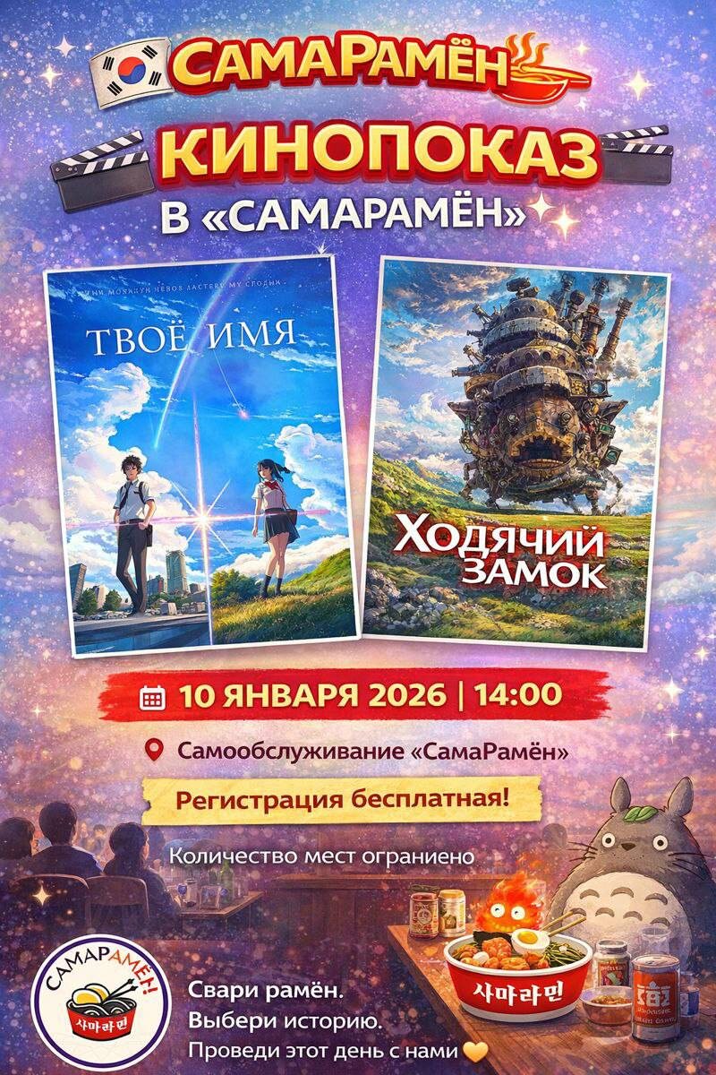 »!! ⏰Начало: 14:00 🍿Что будем смотреть: «Твое имя» и «Ходячий замок» 🎥Регистрация: абсолютно бесплатно Формула лучшего кино-вечера Идеальный рамен + культовое аниме + уютная атмосфера + СамаРамен = комфортный кино-просмотр🍜 Для записи пишите нам в личные сообщения Поспешите, количество мест ОГРАНИЧЕНО‼️