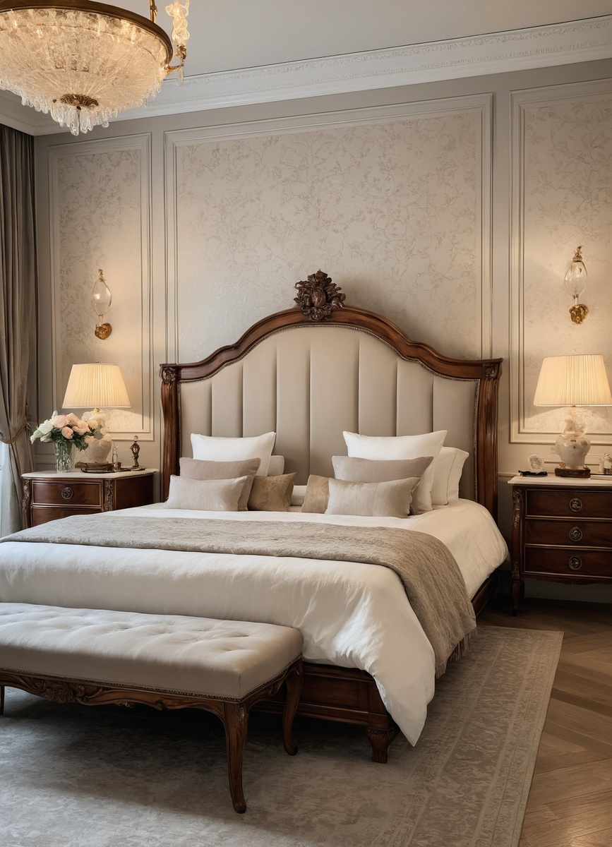 Декоративные элементы играют ключевую роль в создании стиля. Это могут быть антикварные предметы, классические картины и роскошные текстильные изделия, такие как шторы и постельное белье. Освещение также имеет значение: люстры и бра с хрустальными элементами подчеркивают утонченность стиля. Важным аспектом является соблюдение гармонии между функциональностью и эстетикой, что делает спальню уютной и стильной.