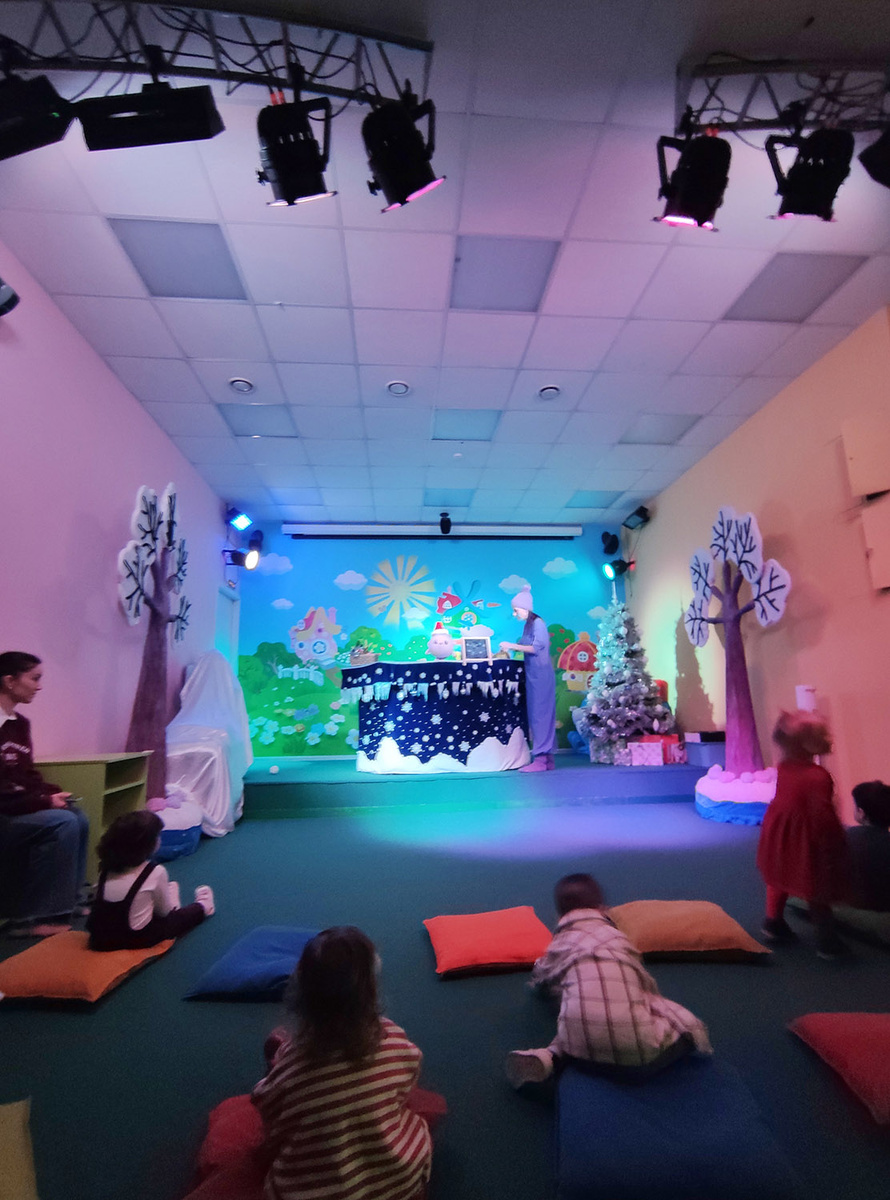 В офисе уютно и комфортно. Есть вода в кулере, видят отопительные лампы. Очень ярко и красиво – рай для визуала. Можно сделать много запоминающихся детских фото. Само мероприятие было довольно стандартным для аудитории от 1.5 до 3 лет: Дед Мороз, анимация, попрыгали, поскакали, шарики, зайчики, снежки покидали, ёлочку нарядили на липучках. Дочка не очень вовлекалась, её интересовали карандаши и игровая зона, я не настаивала. Хотя это тоже говорит об умении аниматоров вовлечь всех детей. Моя отказалась фотографироваться, получать подарок. Кофейный автомат при входе интересовал ее больше.